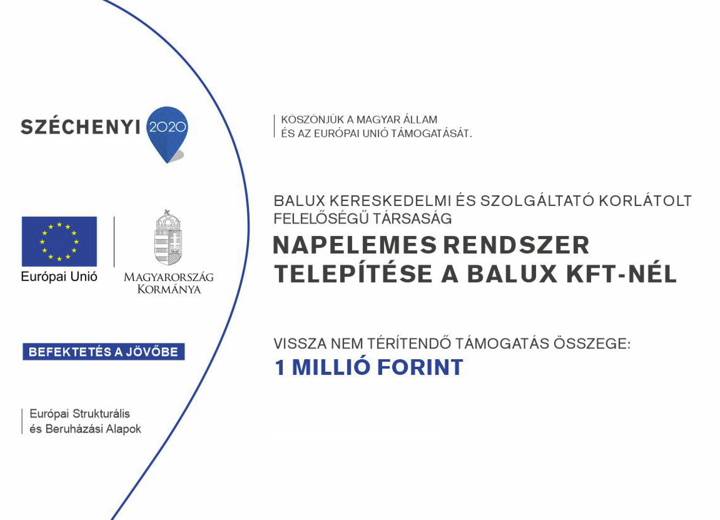 A projekt keretében a Balux Kft. 7622 Pécs, Légszeszgyár u. 23/A cím alatti székhelyén hajt végre napelemes rendszer telepítést. A fejlesztés során a székhely épületén egy 5 kW-os rendszer kerül telepítésre. A telepítést követően várhatóan nagymértékben csökken a cég nem megújuló energiából előállított energiafogyasztása. A fejlesztés jelentős mértékben hozzájárul a hazai és uniós törekvésekhez a megújuló energia hasznosítás/kapacitások növelése és a károsanyag-kibocsátás csökkenése terén.